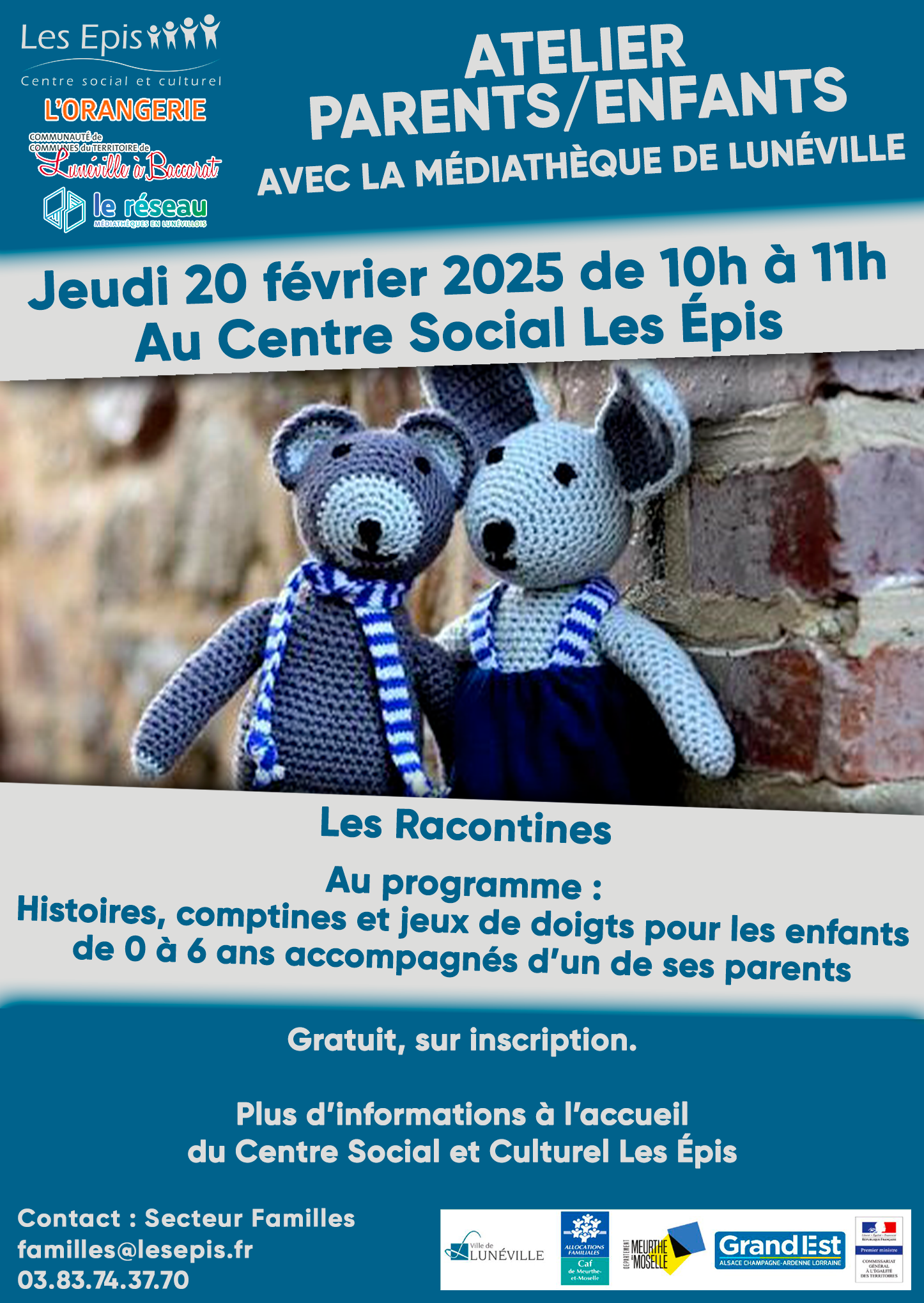 Atelier Racontine + Ajouter à mon Agenda Google + iCal / Outlook export Date 20 Fév 2025 Expiré! Heure 10h00 - 11h00 Labels Gratuit,Sur inscription Lieu Centre Social et Culturel Les Épis 4 Avenue du Général de Gaulle Catégorie Atelier Racontine Secteur Familles Organisateur Secteur Familles Téléphone 0383743770 Email familles@lesepis.fr Partagez cet événement