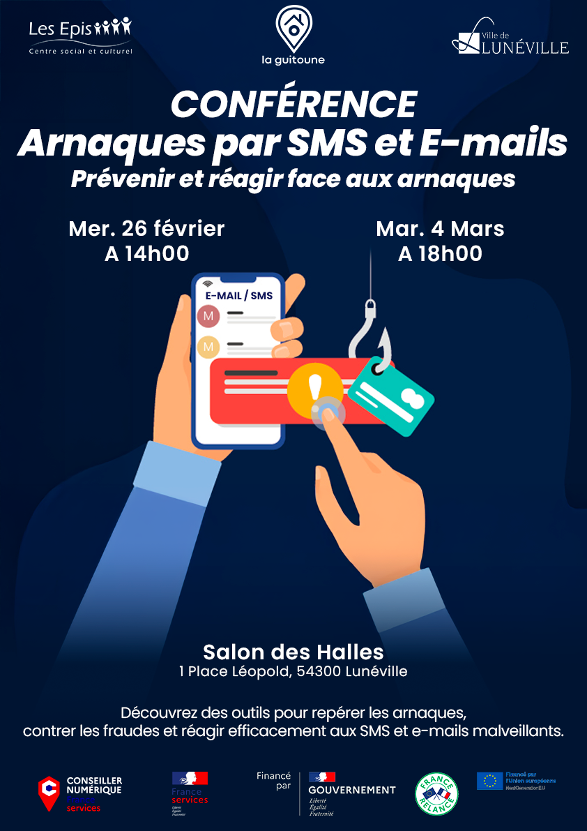 Conférence : Arnaques par SMS et E-mails Prévenir et réagir face aux arnaques. + Ajouter à mon Agenda Google + iCal / Outlook export Date 04 Mar 2025 Expiré! Heure 14h00 Labels Gratuit Lieu Salon des Halles 1 Place Léopold, 54300 Lunéville Catégorie Adultes/Seniors Événéments Organisateur Centre Social et Culturel Les Épis Téléphone 0383743770 Email secretariat@lesepis.fr Autres organisateurs Guitoune Téléphone 0611225980 Email guitoune@lesepis.fr Ville de Lunéville Téléphone 0383762300 Email accueil@mairie-luneville.fr Site Web https://luneville.fr/ Partagez cet événement