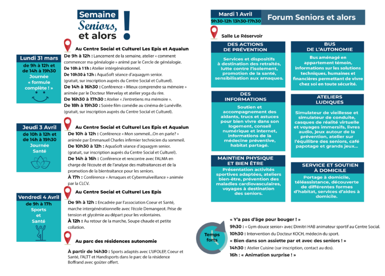 5e édition de la Semaine des Seniors : Préparez-vous à une semaine exceptionnelle, du 31 mars au 4 avril 2025 ! Cette édition promet une programmation riche et diversifiée, avec une multitude d'activités, d'ateliers interactifs et de conférences gratuites, spécialement conçues pour répondre aux besoins et aux centres d'intérêt de notre public senior.